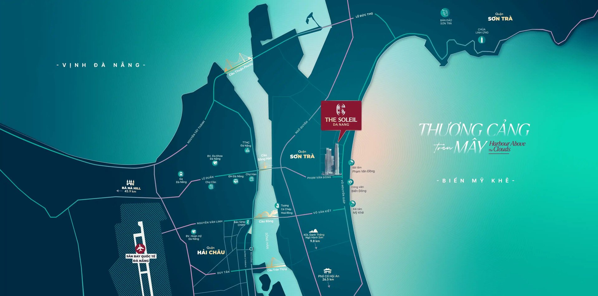 Dự án The Soleil Đà Nẵng tọa lạc trên khu đất vàng sở hữu 4 mặt tiền đắt giá giao giữa đường Võ Nguyên Giáp và Phạm Văn Đồng, The Soleil Đà Nẵng được ví như “thiên đường đáng sống bậc nhất Việt Nam” – nơi hội tụ tinh hoa nghỉ dưỡng, thương mại và du lịch quốc tế.